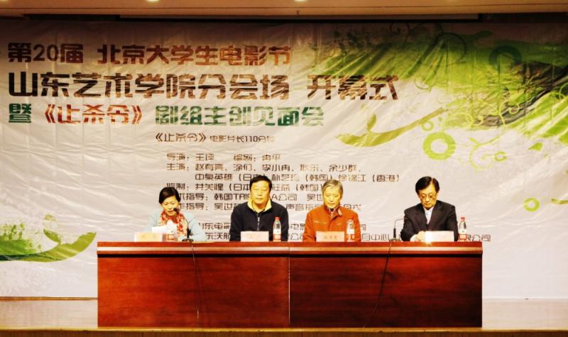 4月22日下午二时,第20届北京大学生电影节山东分会场活动在山东艺术学院长清校区图书馆报告厅隆重开幕。开幕仪式以《止杀令》展映暨主创见面会和启动电影节分会场活动为主题。《止杀令》导演、山东电影制片厂厂长王坪,本片主演、中国国家话剧院前院长兼党委书记赵有亮,与400余位师生交流研讨。开幕式由传媒学院党总支书记刘昂主持。