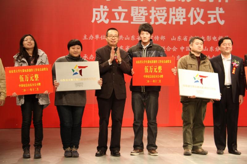 12月16日上午,山东省大学生微电影创作工作室成立暨授牌仪式在山东工艺美术学院数字媒体展厅举行。本次活动由中国山东省委宣传部、山东省广播电影电视局、山东省文学艺术界联合会、中国电信山东分公司主办,山东师范大学、山东艺术学院、山东工艺美术学院、聊城大学、青岛农业大学五所院校的师生代表参加了仪式。我校传媒学院青年教师周筠、学生代表王东伟,上台领取了山东艺术学院微电影工作室牌匾和五万元启动资金。