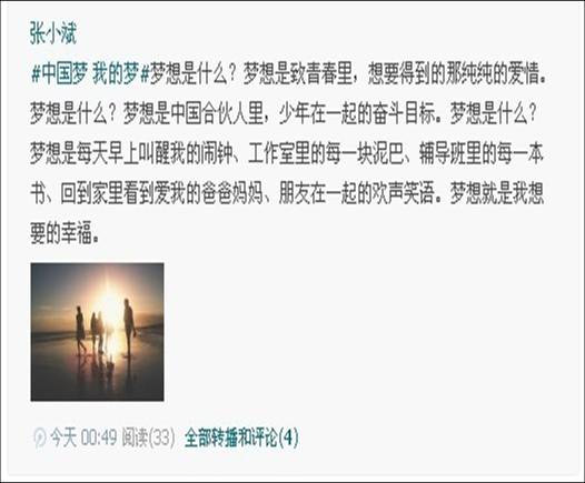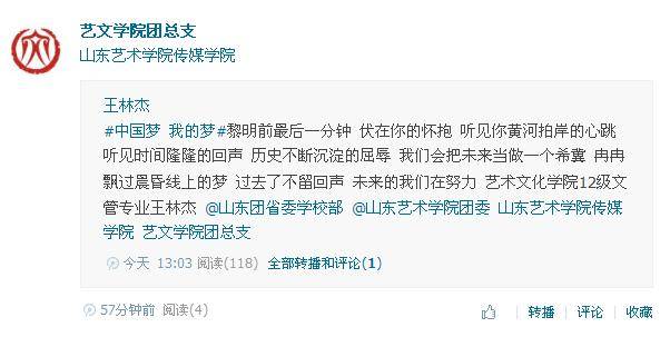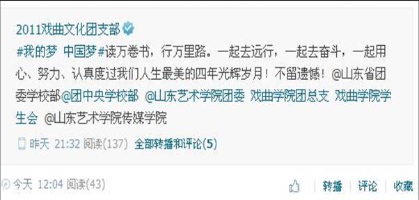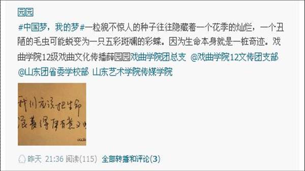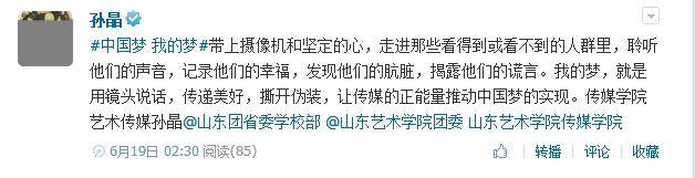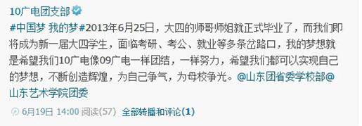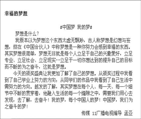 本站讯 (通讯员:位茜 高祎峰)为贯彻习近平总书记“五四”讲话精神,引导山艺青年学子为实现中国梦而努力奋斗,2013年6月27日下午6点30分,由山东艺术学院团委主办,山东艺术学院传媒学院承办的“我所理解的中国梦”微博编创大赛决赛在传媒学院报告厅顺利举办,担任决赛评委的有山东艺术学院学生会主席罗丞坤,志愿者协会会长张守辉及其他各二级学院主席。 经过前期预赛环节的激烈角逐,今天进入决赛的共有31条优秀团支部微博和46条优秀个人微博。决赛在主持人热情洋溢的开场词中拉开帷幕,主持人宣读比赛评分标准后,比赛进入第一环节:优秀团支部微博评选。经过在场评委认真评审,共评选出一等奖6名,二等奖10名,三等奖16名。戏曲学院2011级戏曲文化传播团支部的作品“读万卷书,行万里路,一起去远行,一起去奋斗,努力、认真度过我们人生最美的四年光辉岁月!不留遗憾!”以其朴实的言语,积极的生活态度夺得一等奖的桂冠。传媒学院12级广播电视编导(中澳中韩)团支部作品“我们的中国梦就是班级学习共同提高,共同进步。学成归来日,报效国家时。不管人在哪里,不管班级在哪里,我们的心永远在一起。”发自肺腑的话语让在场的人深受触动,与其他九个团支部共获二等奖。 接下来的个人优秀微博评选更是精彩纷呈,内容丰富,包括长微博、图片、视频等多种形式,山艺学子们对于中国梦,民族梦,个人梦的理解可谓是仁者见仁,智者见智。戏剧学院12舞美专业的李雅文的微博表达了绿色环保梦:“我梦想有一天,我们生活中不在再到处充斥着白色垃圾,路边的水沟里不再是污水,我们呼吸到的不再是刺鼻的有毒气体。而是优美的环境,清新的空气,清澈的小溪里有鱼儿在游弋。”获得评委的一致好评,获得一等奖。传媒学院12影视摄制专业范淑君同学说:“中国梦是由华夏儿女共同的梦所汇集而成。我的梦想是做一位优秀的传媒人,因为梦想,所以从现在开始积累最基本的媒介素养,以公正的角度报告社会现象。我相信每天的努力都让我离梦想更进一步!”其扎根现实,立足当下的梦想收到了评委的青睐,获得个人组的二等奖。梦想可以闪光,在这场关于梦想的饕餮盛宴中,我们品尝挫折,分享快乐。在愉快轻松的气氛中,比赛落下了帷幕。最终共评选出优秀个人微博一等奖9名,二等奖14名,三等奖23名。 本次活动,为山艺学子搭建了一个表达梦想的平台,活动展现了当代大学生积极向上的精神风貌,加深了同学们对“中国梦”的理解。中国梦是民族的梦,也是每个中国人的梦,真正热爱生命和珍惜感动的年轻人都应怀抱着一份美好的梦想,只要我们紧密团结,万众一心,为实现共同梦想而奋斗,实现梦想的力量就无比强大。今天我们给梦想一个盛放的契机,给梦想一种留存的方式,梦想就会回馈给我们更为强大的力量,正是因为梦的支撑,生命有了绽放的可能!附:部分获奖作品